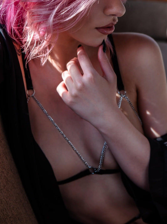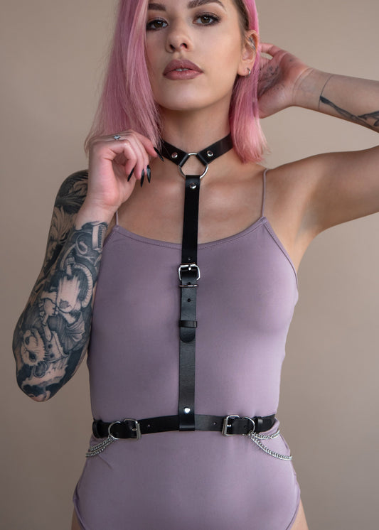 Postroj s řetězy na boky a stehna - černý dámský postroj