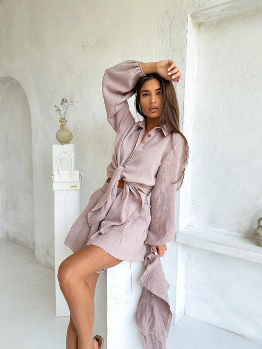Oversize-Set aus beigen Musselin-Shorts und -Hemd