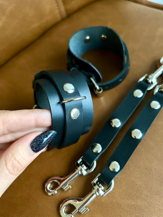 Handschellen aus massivem Leder mit Karabinern und Verbindungsstücken – Set