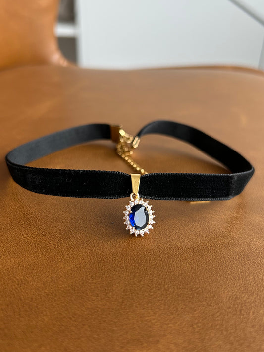 Black Velvet - Neck Choker with a Navy Blue Pendant with Cubic Zirconias