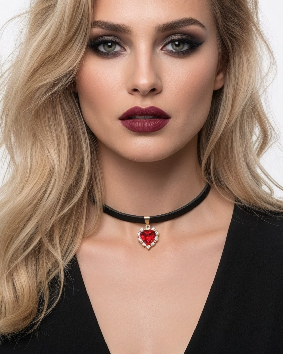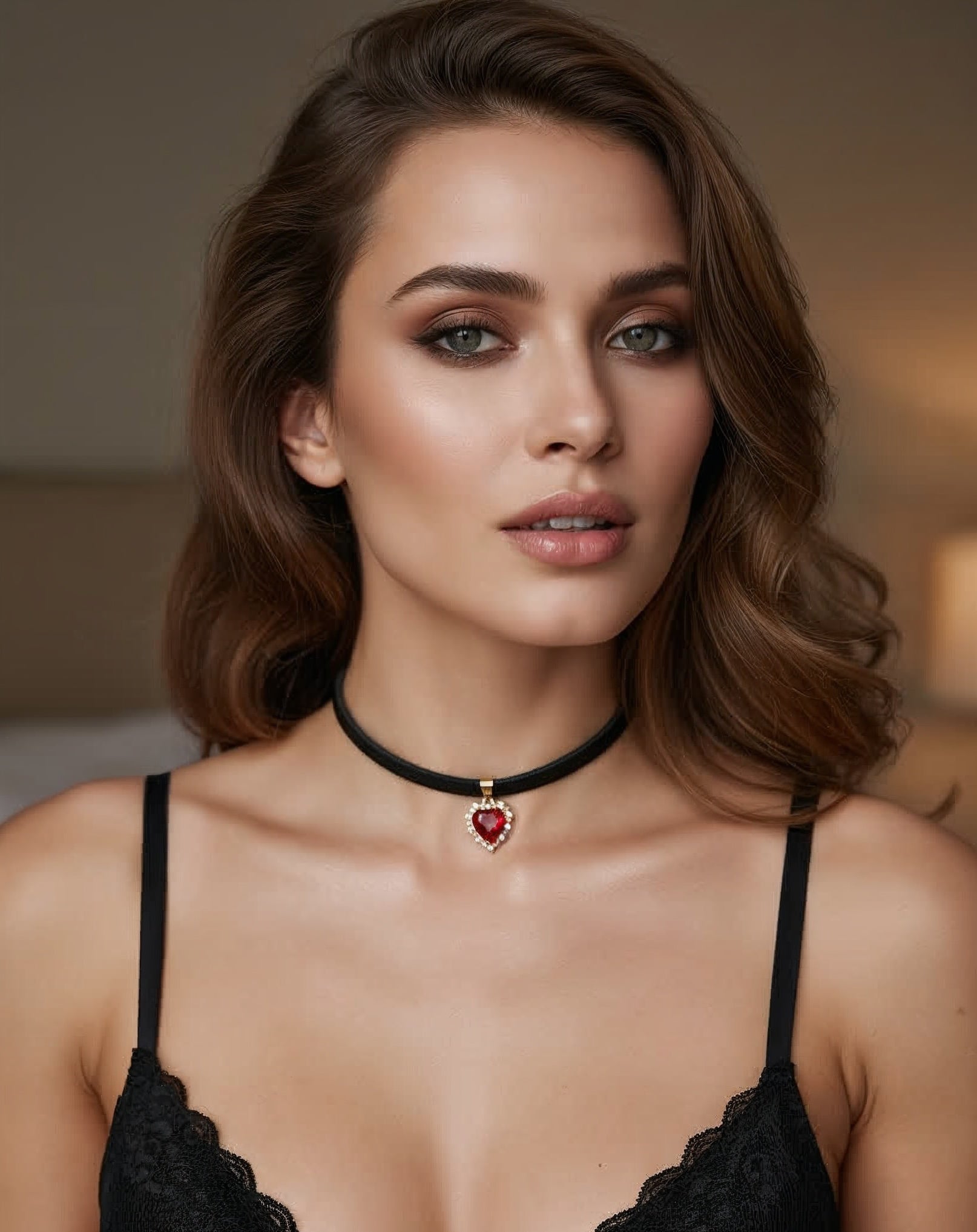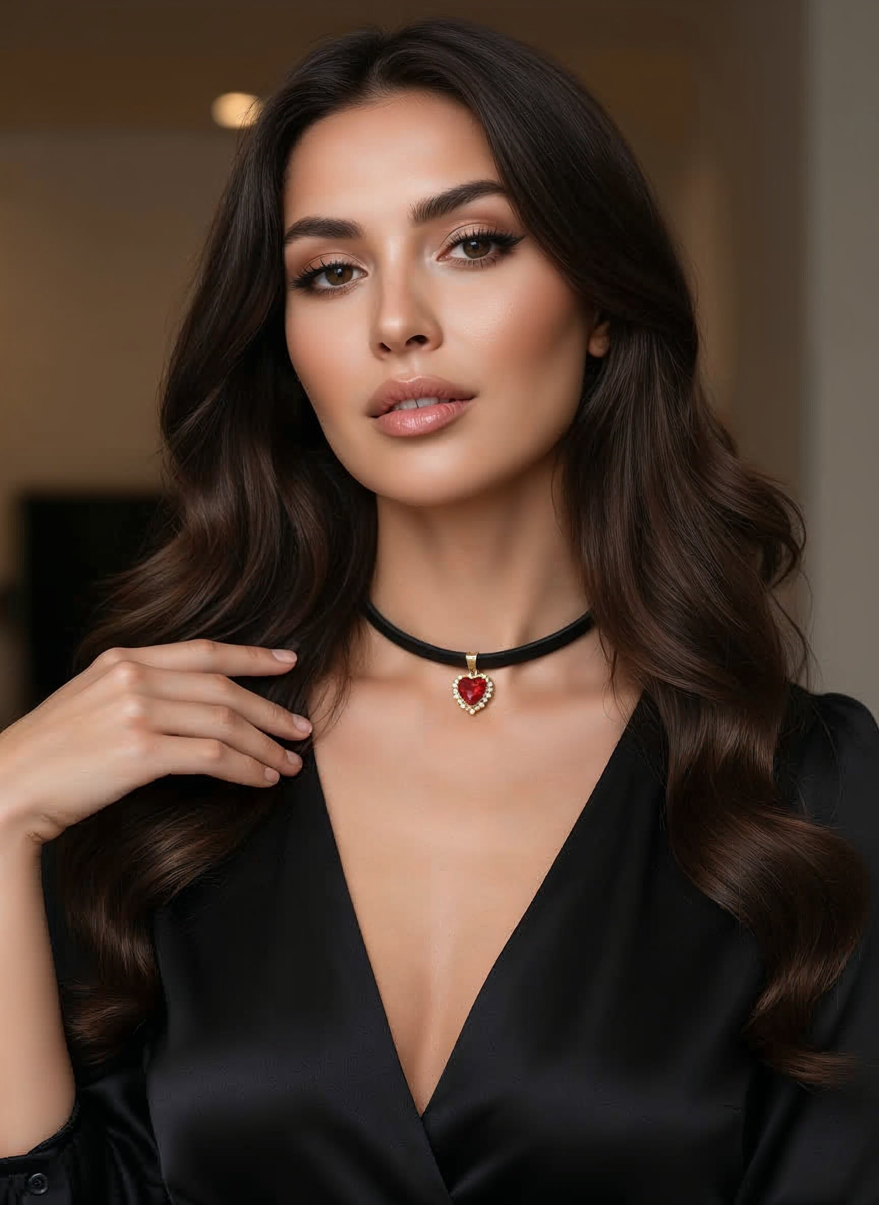 Zwarte leren halsketting met hanger - zilverrood hart met kubieke zirkonia